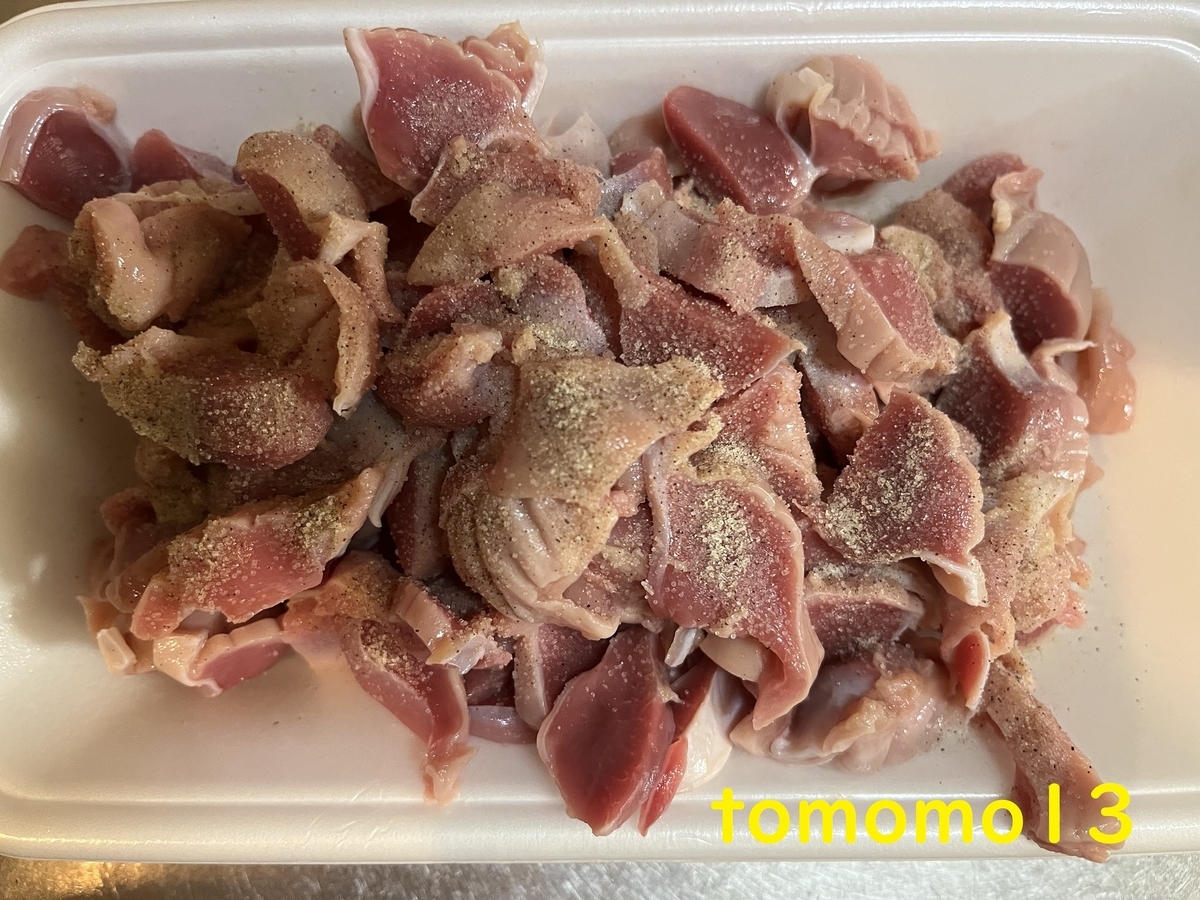 砂肝は適当にスライスをして塩こしょうをまぶしておきます。