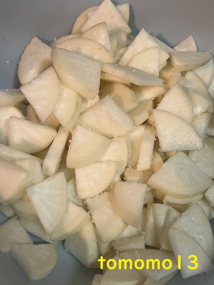 そこへふんわりと軽い塩をまぶして揉み込んで5分程度おきます。