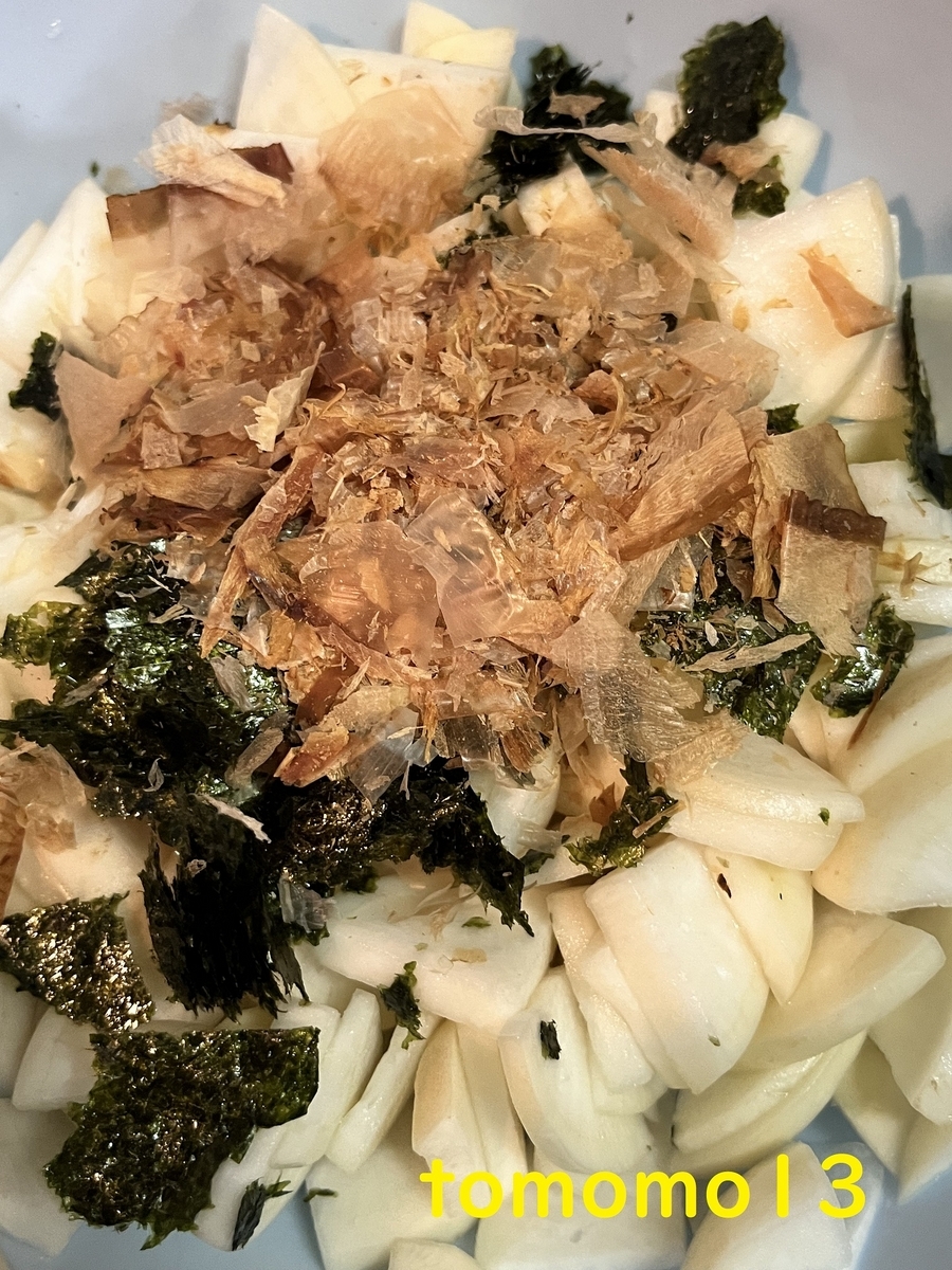 かつお節のうまみ成分(イノシン酸)と海苔のうまみ成分(グルタミン酸・イノシン酸・グアニル酸)が入っているので、贅沢な和え物だと思う。