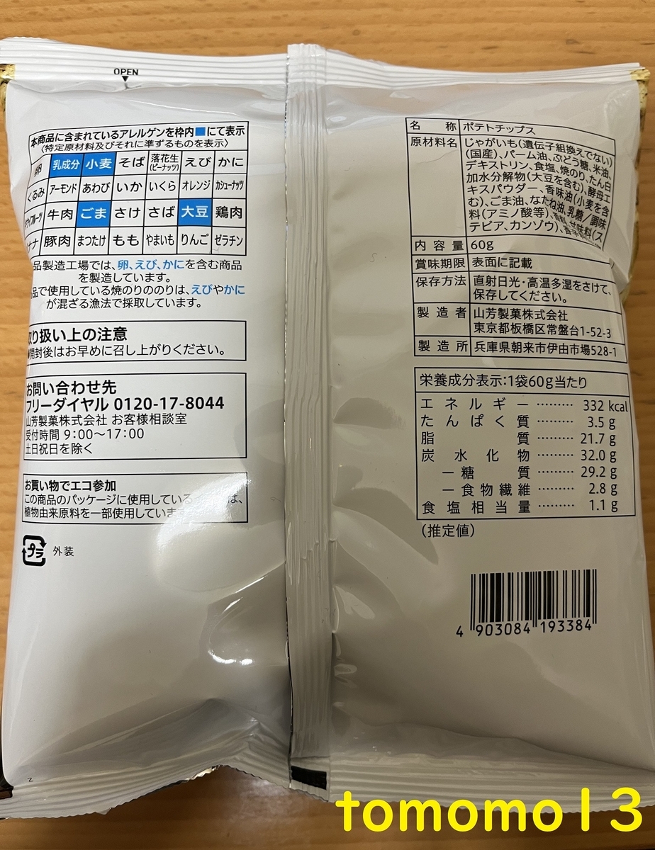 原材料はじゃがいも、パーム油、ぶどう糖、米油、デキストリン、食塩、焼きのり、たん白加水分解物、酵母エキスパウダー、香味油、ごま油、菜種油、乳糖など。