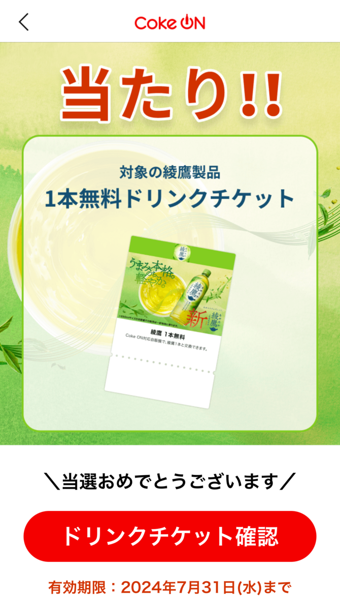 Coke ONアプリで50万名様に『綾鷹』が1本無料で貰えるドリンクチケットが期間限定で登場。