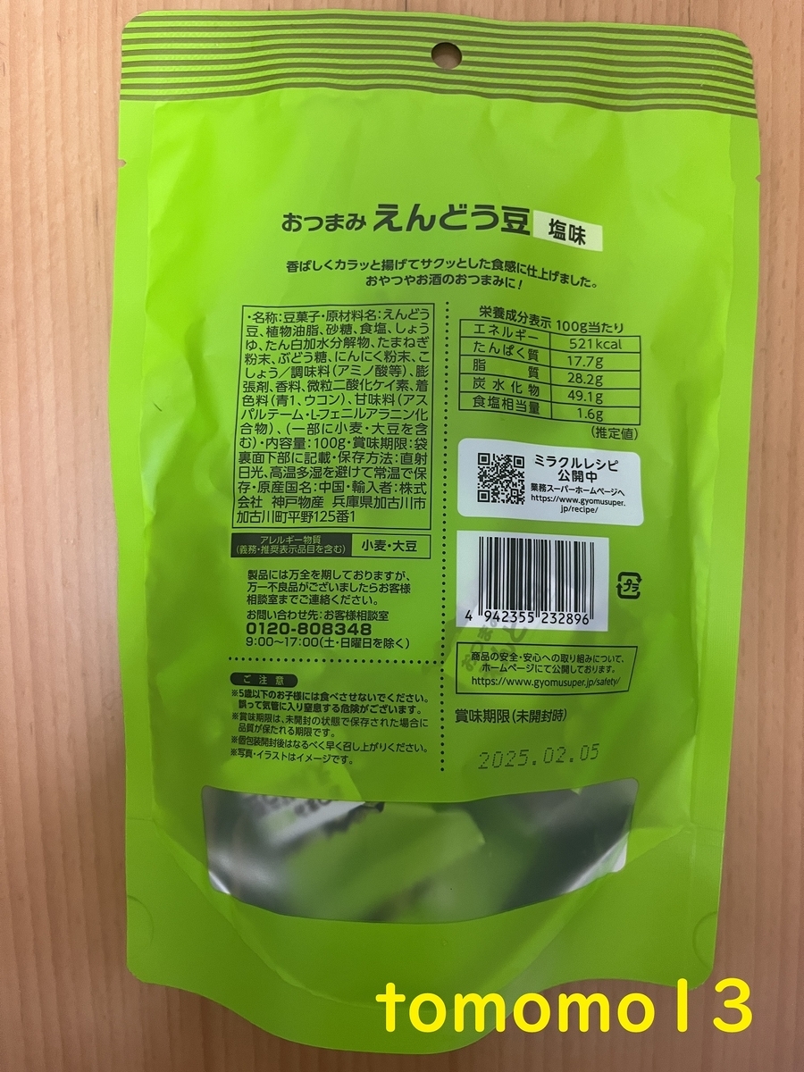 業務スーパー『おつまみ えんどう豆 塩味』です。