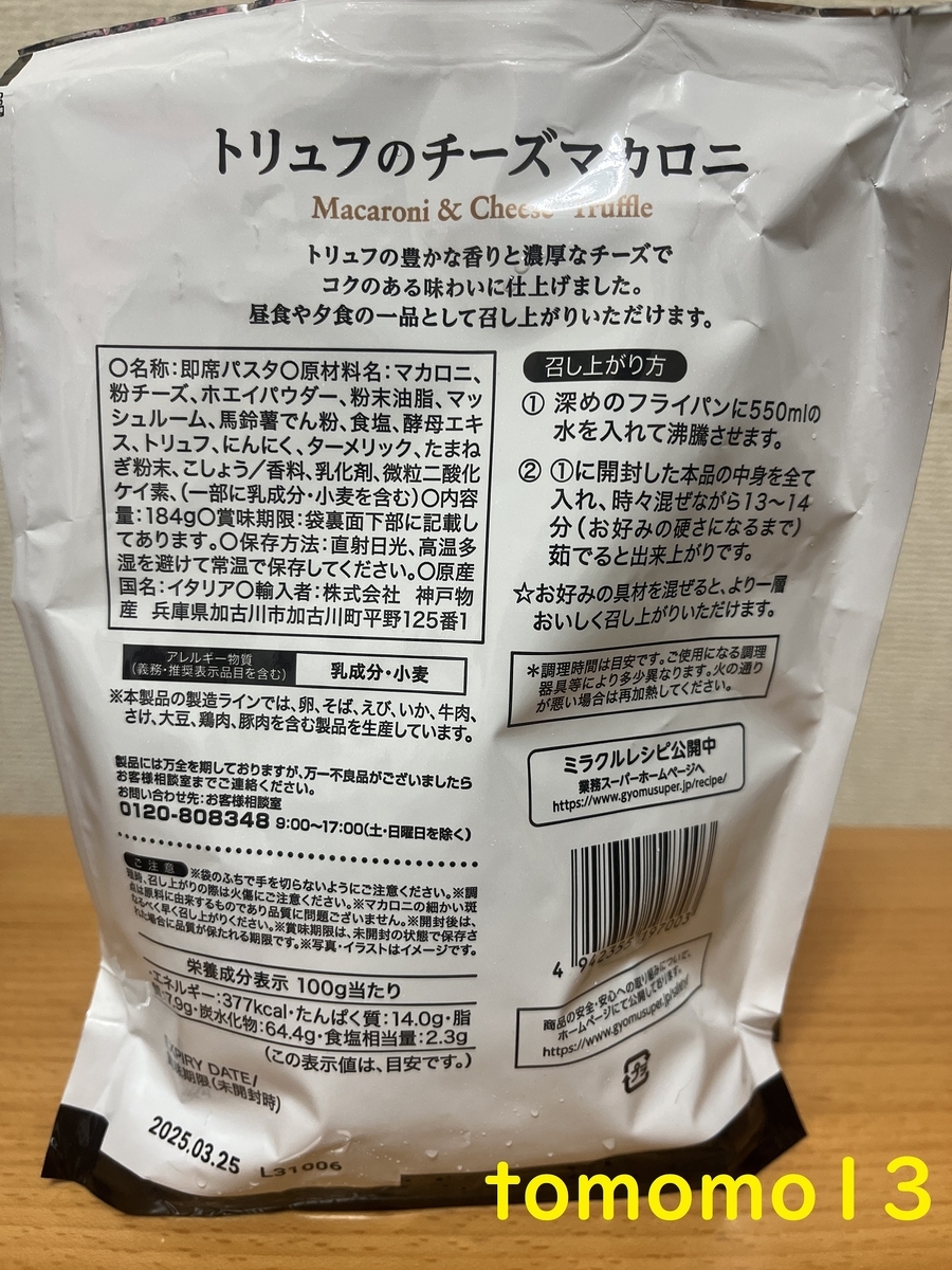 原材料はマカロニ、粉チーズ、ホエイパウダー、粉末油脂、マッシュルーム、馬鈴薯でん粉、食塩、酵母エキス、トリュフ、にんにく、ターメリック、たまねぎ粉末、こしょうなど。