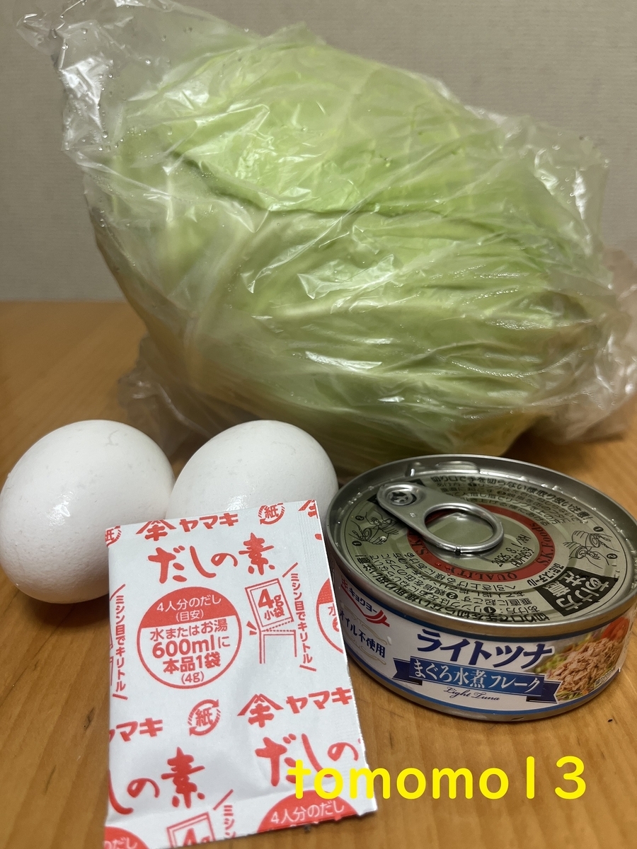 今回の食材と調味料はキャベツ1/4、卵2個、ツナ缶(なくてもいい)、和風だしの素。