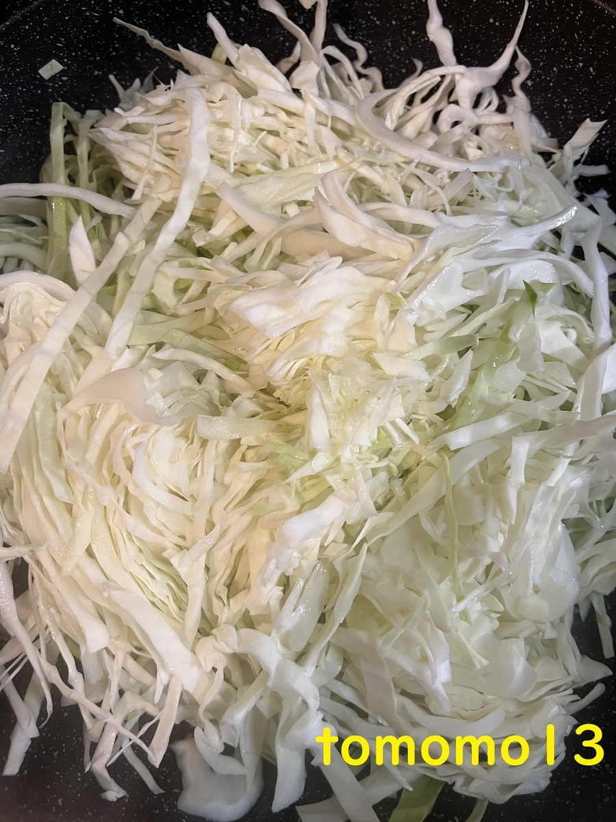 キャベツは千切りにカットし、フライパンに油を引いてしんなりするまで炒めます。