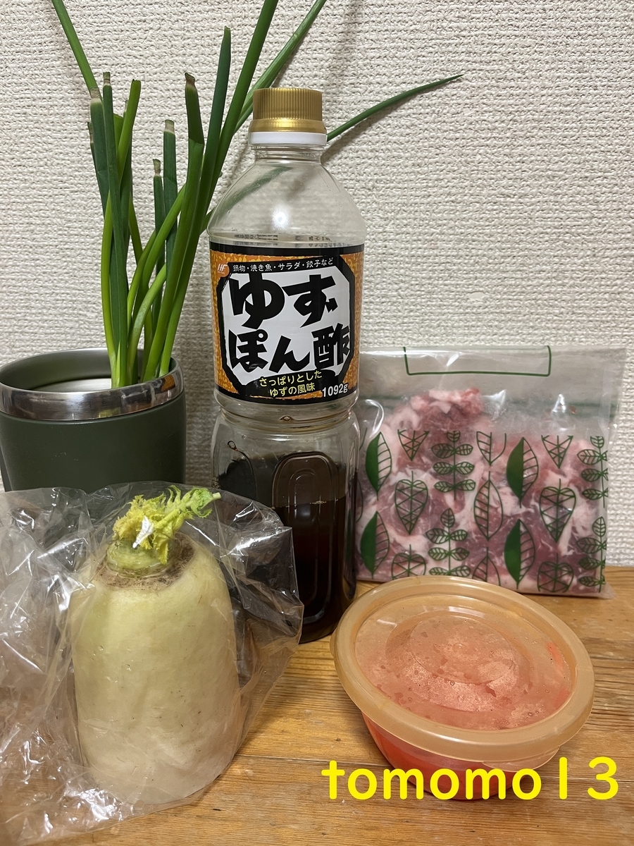豚肉(細切れ)、大根、ネギ、紅しょうが、ポン酢。