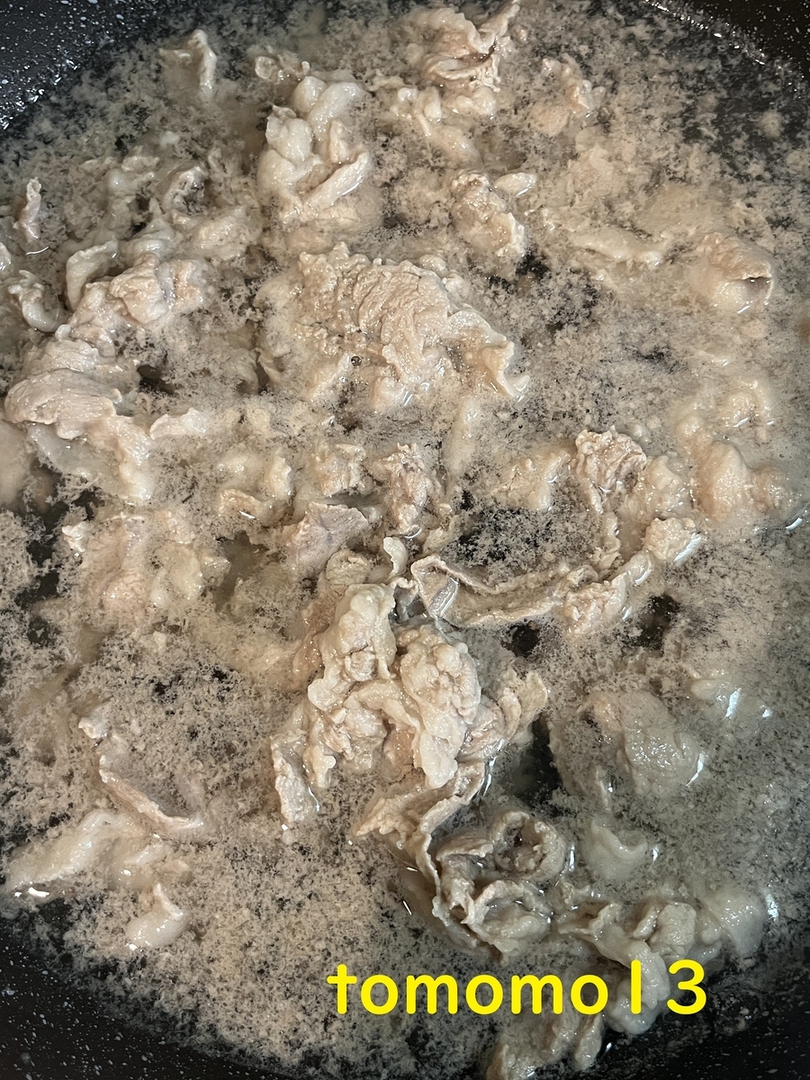 沸騰したら豚肉をドーンと入れて茹でます。