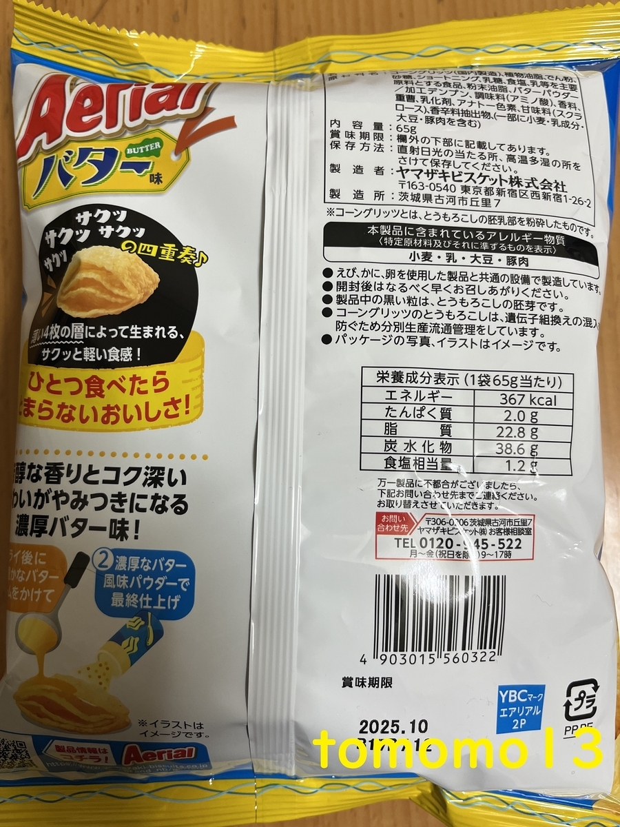『エアリアル バター味』は薄い4枚の層になった濃厚なバター風味の軽い食感のスナック菓子です。