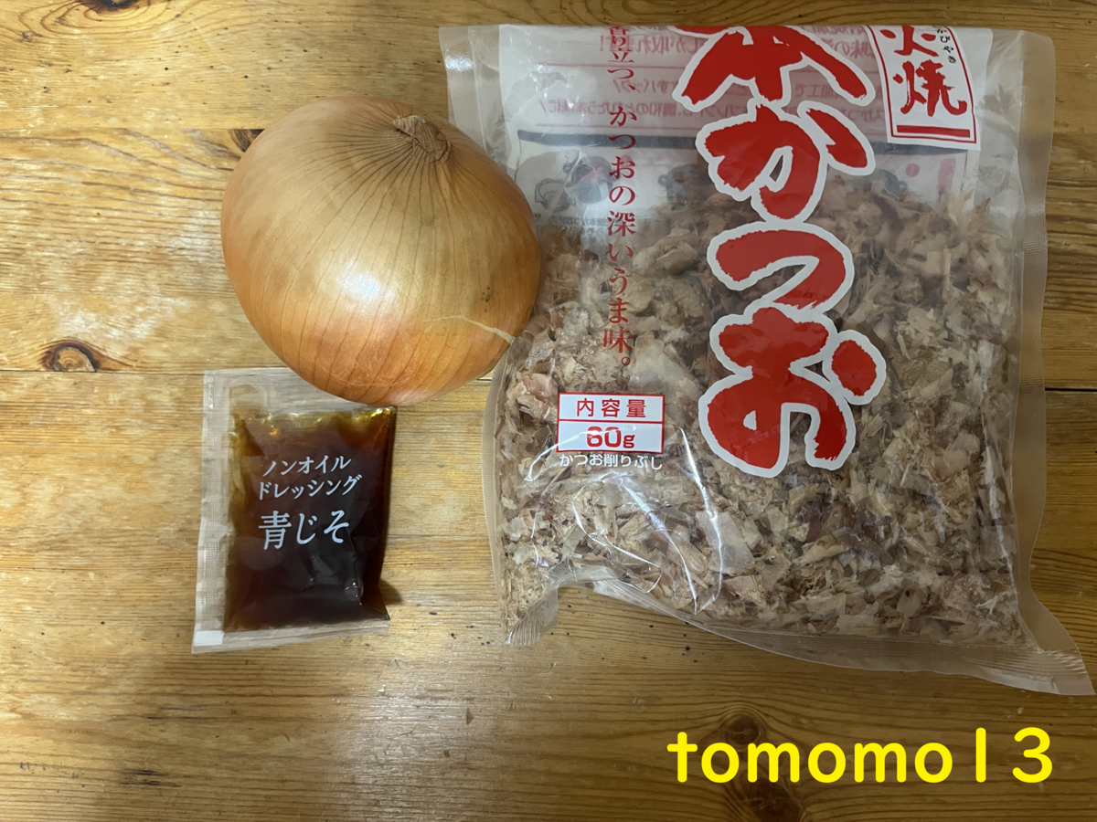 玉葱、かつお節、ずっと放置していたノンオイルドレッシング青じそ。笑