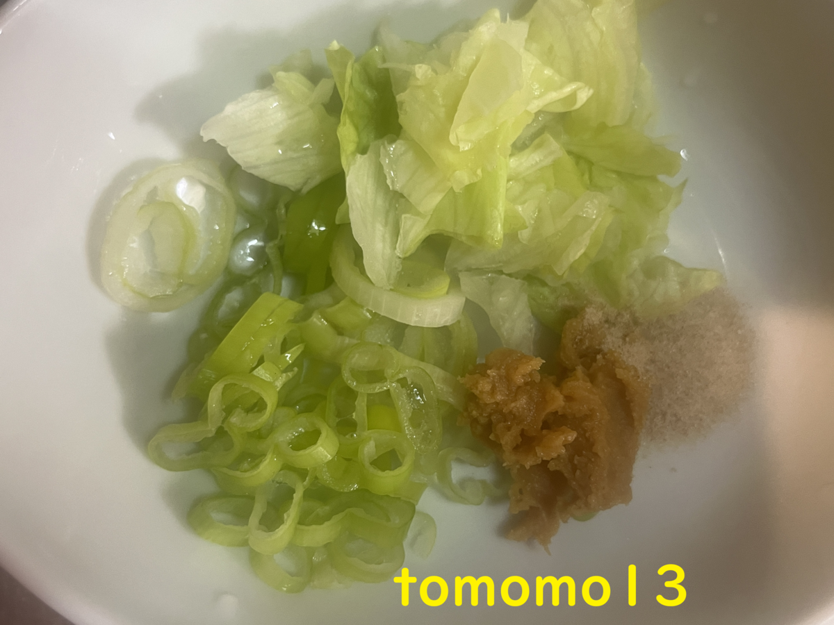 ネギは小口切りをして器にレタスとネギ、和風だし、味噌を入れておきます。