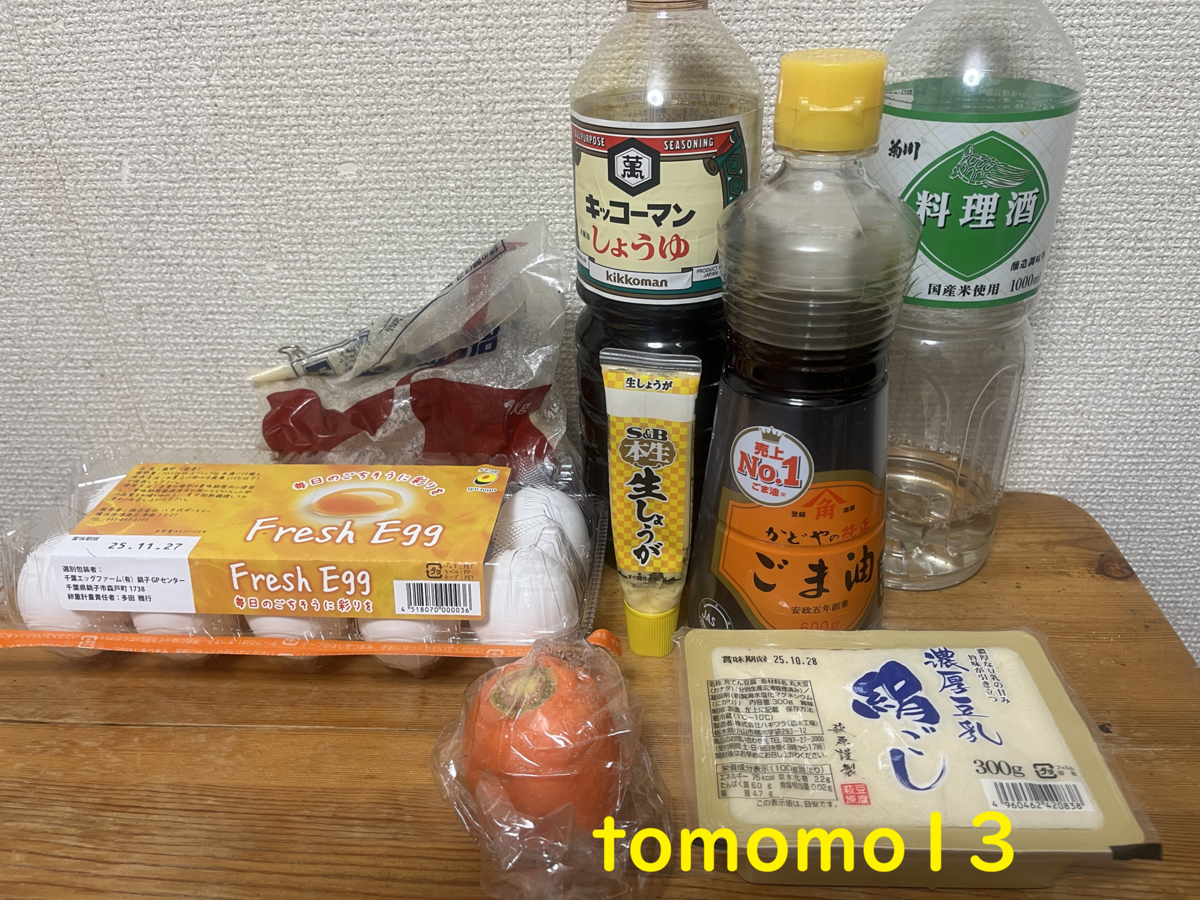 冷凍豆腐(解凍しておく)、卵、人参、醤油、酒、砂糖、しょうがチューブ、ごま油。