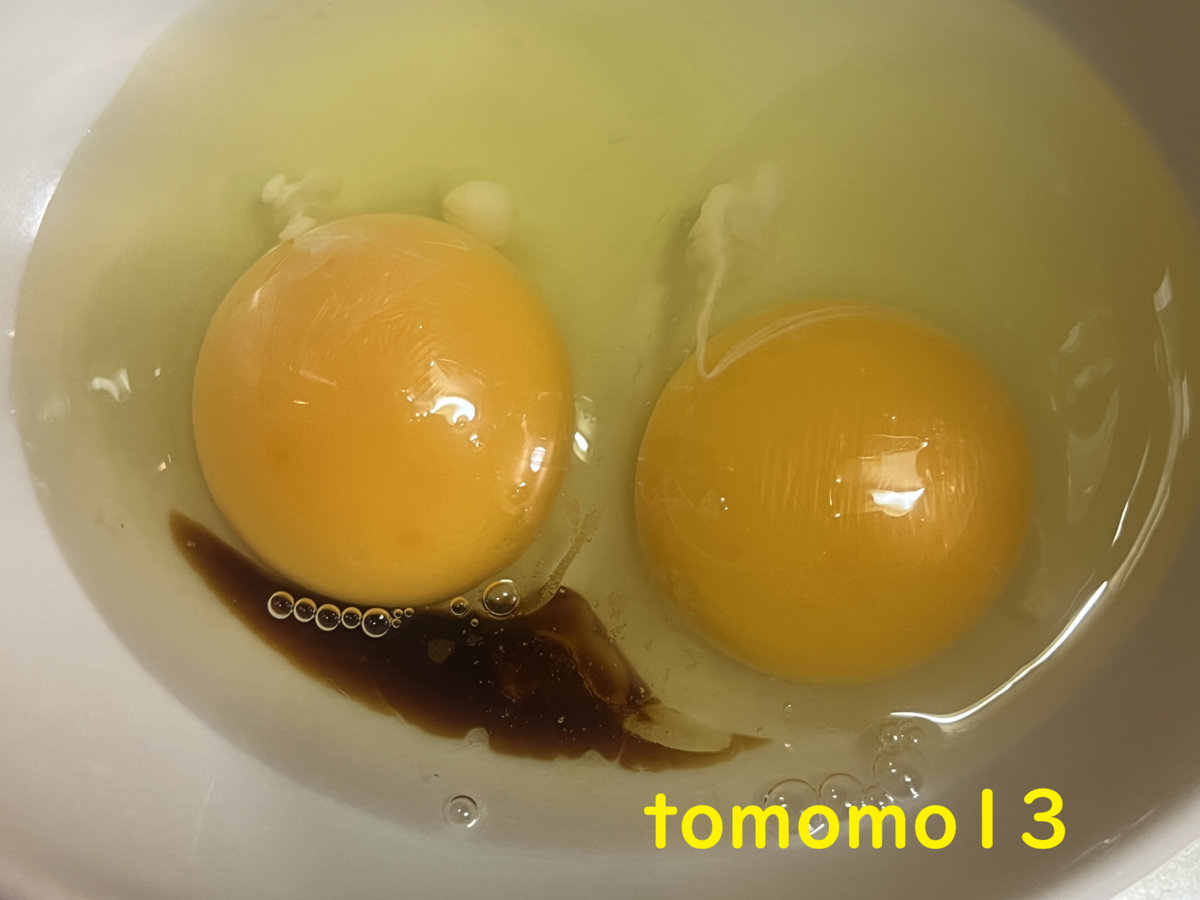 卵は器に入れて、醤油と酒を入れてかき混ぜる。