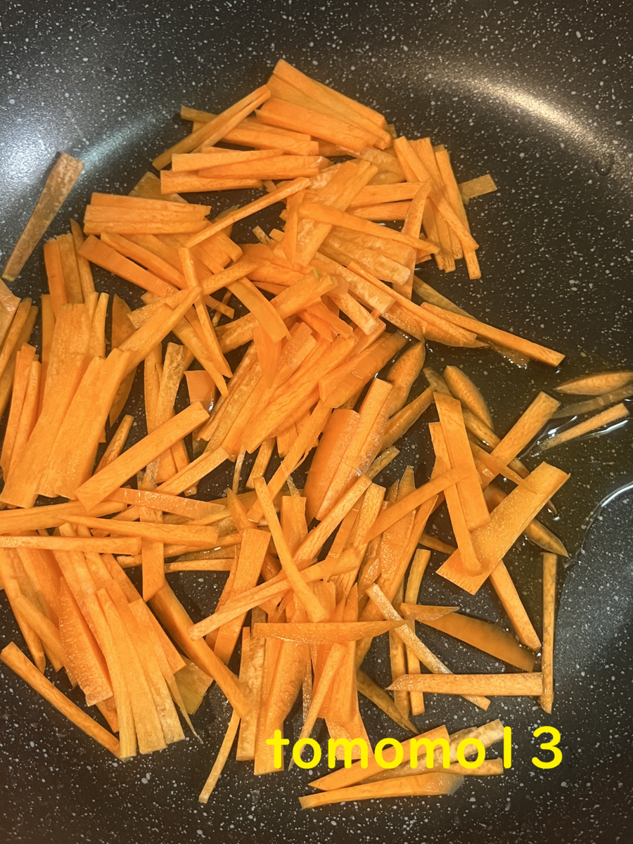 人参はチョイ太めの千切りにしてごま油で加熱。