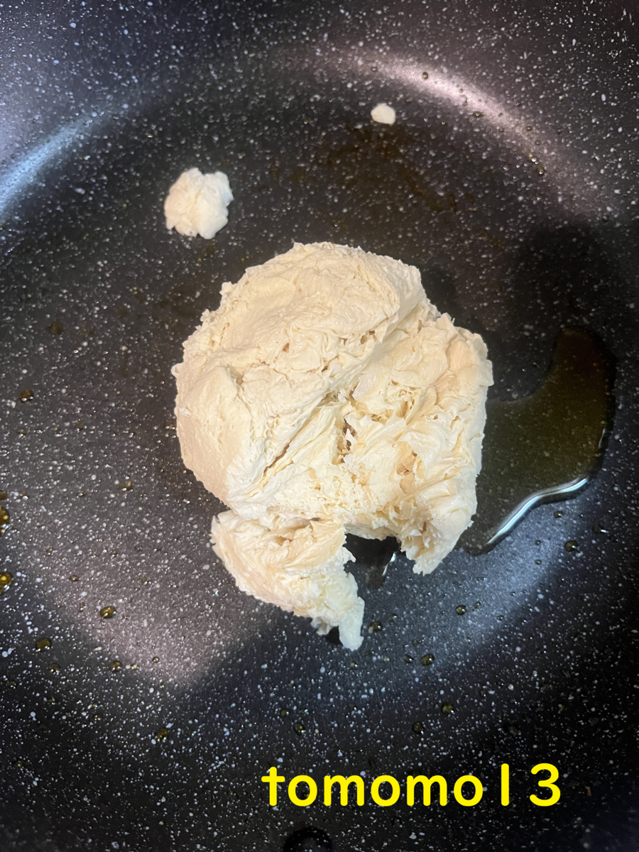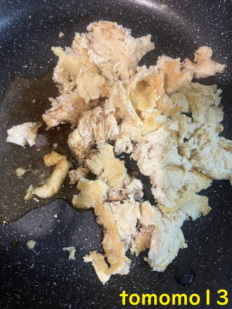 冷凍豆腐は水気を切り、ごま油を引いたフライパンでそぼろ状にしながら加熱していきます。